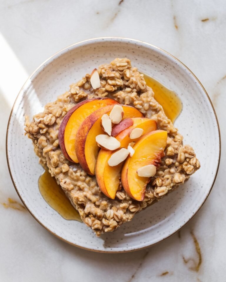Indulge in this vegan peach oatmeal bake that tastes like dessert but nourishes like breakfast – want to know the secret ingredient?
