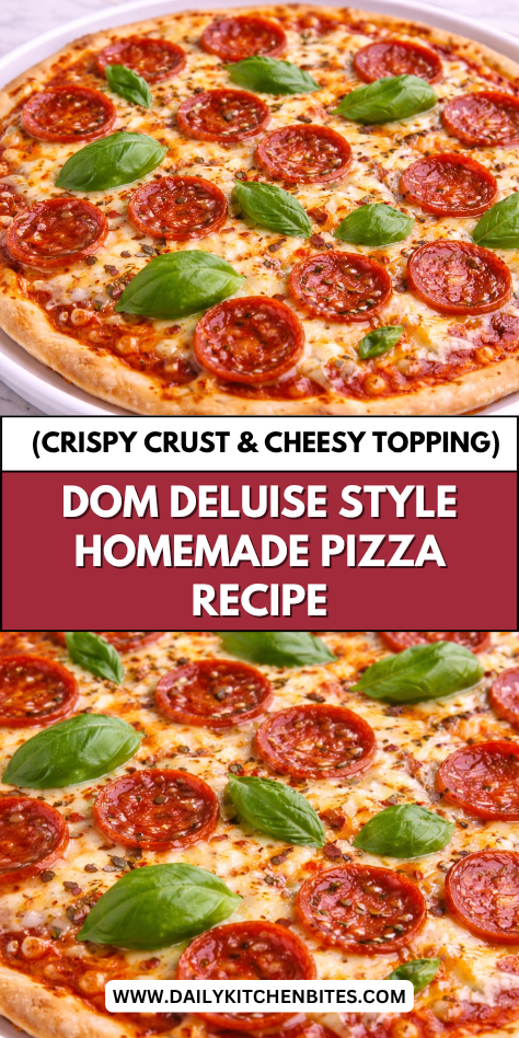 This Dom DeLuise style homemade pizza delivers that perfect combination of crispy crust and gooey, melted cheese. The dough bakes up golden on the outside while staying soft and airy inside.
