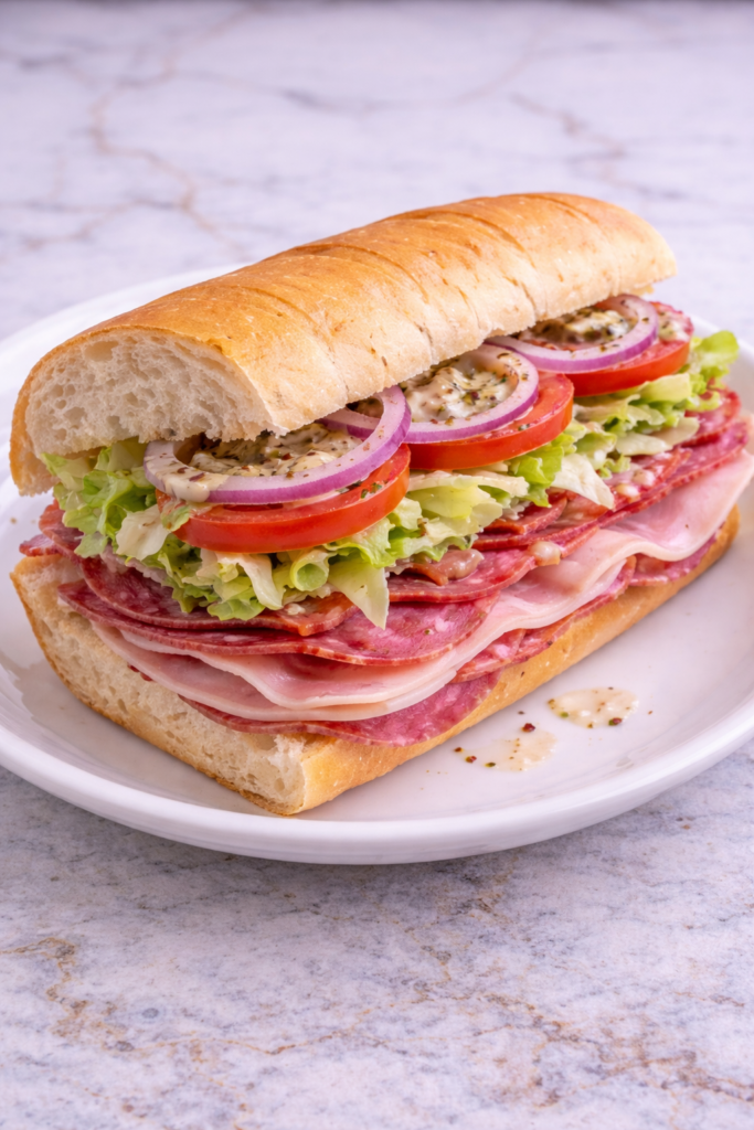 This sandwich is packed with bold, satisfying flavors in every bite. The layers of salami, capicola, ham, and provolone create a rich and savory base, while the fresh lettuce, tomato, and onion add crunch and brightness. The balance makes it both hearty and refreshing at the same time.