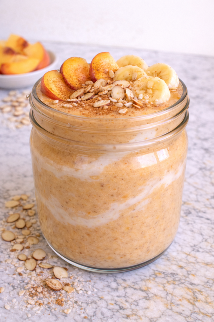 The peaches provide a soft, juicy fruit flavor that feels refreshing without being sharp, while the banana adds natural sweetness and body that makes the smoothie feel filling and comforting.