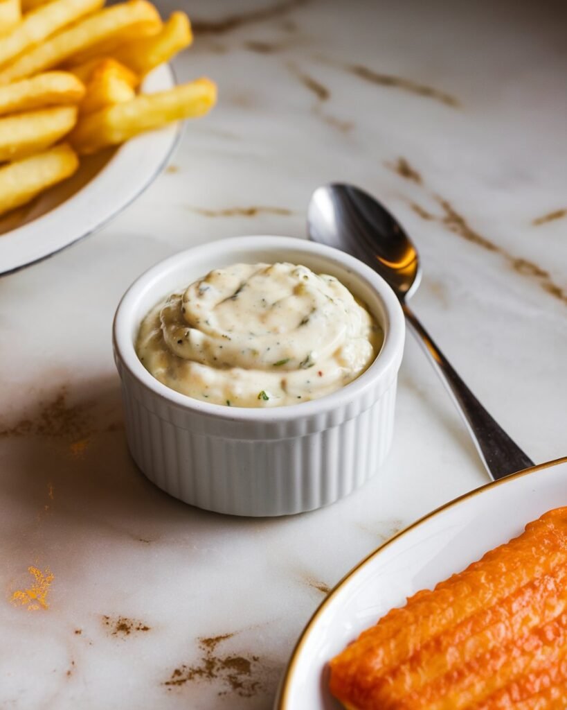 AI Image Prompt: Small ramekin of tartar sauce served next to crispy fries and a fish sandwich on a serving board. White marble counters with hints of gold, natural lighting, iPhone 15 Pro top-down blogger shot.